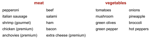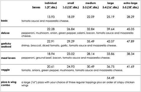 Start with a Basic pizza (Mozzarella Cheese & Tomato Sauce) and add your favourite ingredients (prices are charged per topping):
